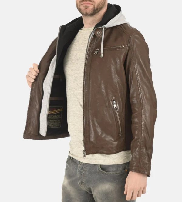 Men Brown Removable Hood Leather Jacket