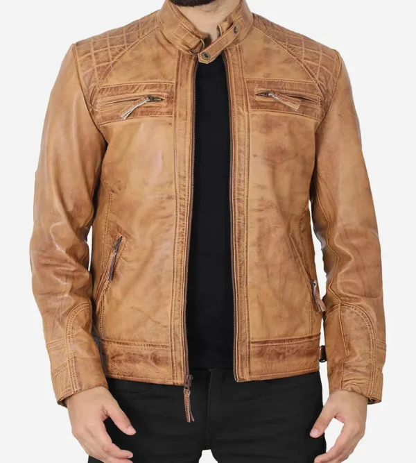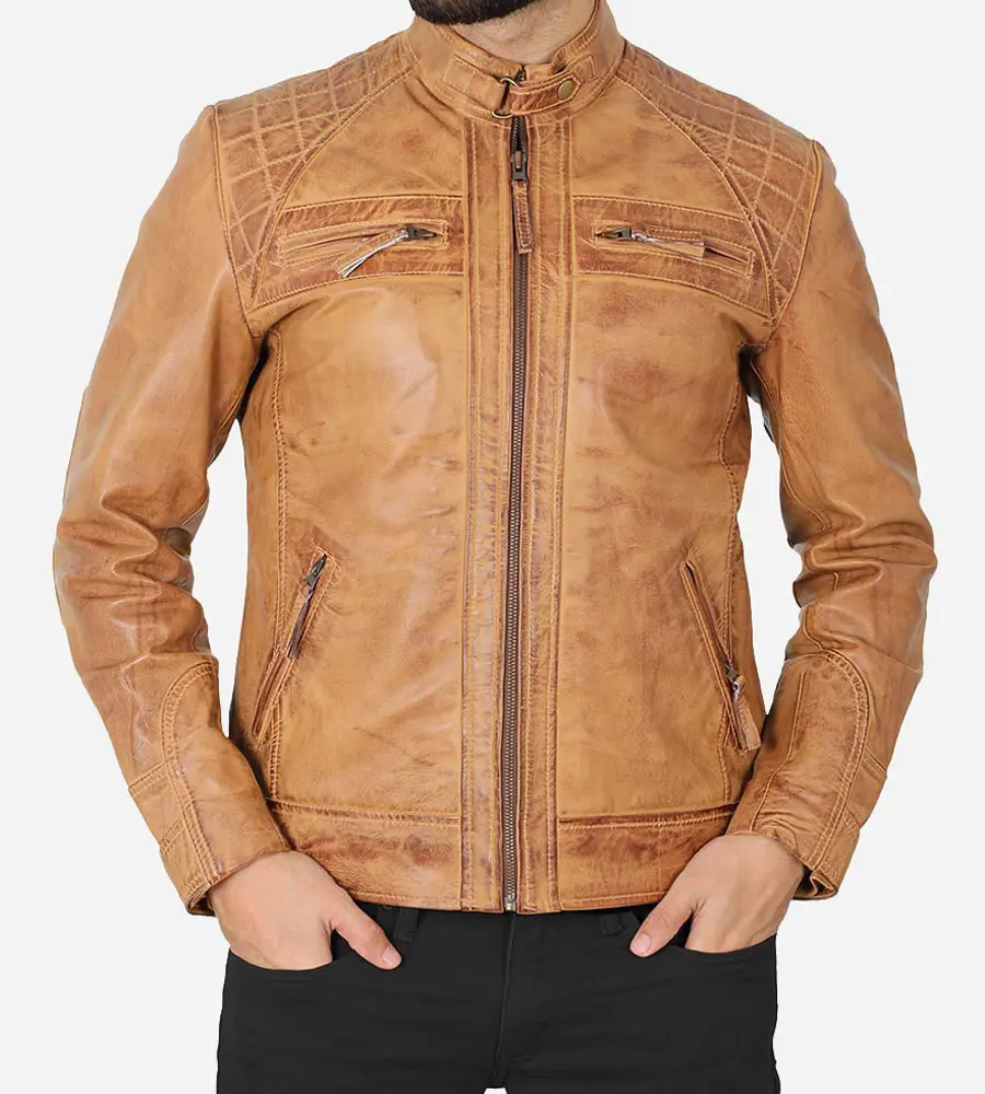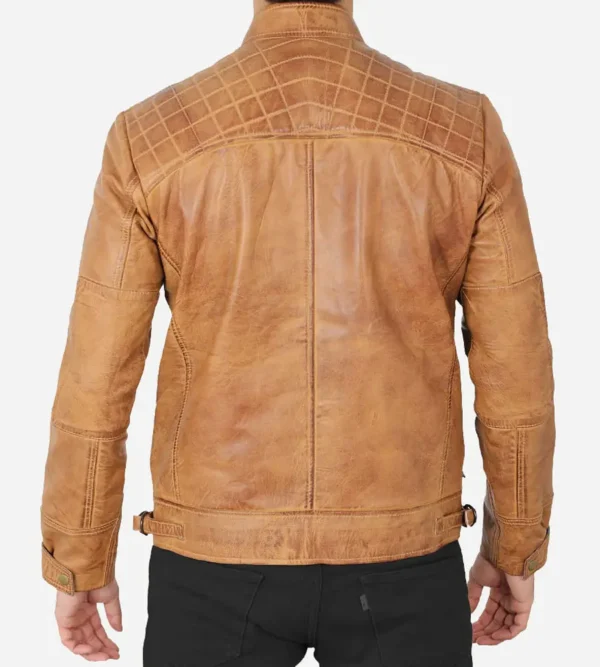 Men Cafe Racer Camel Brown Quilted Leather Jacket