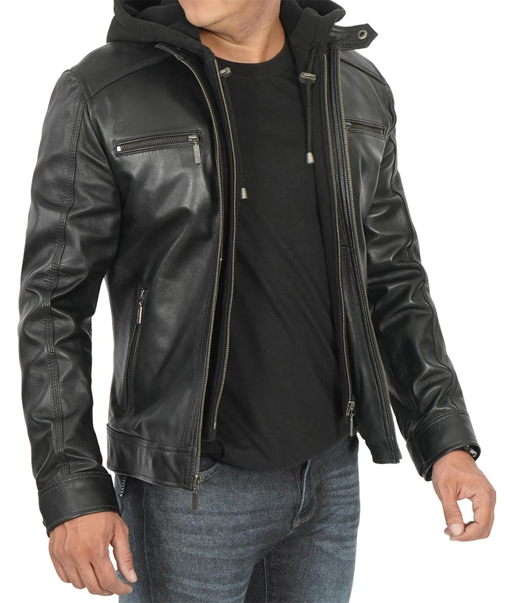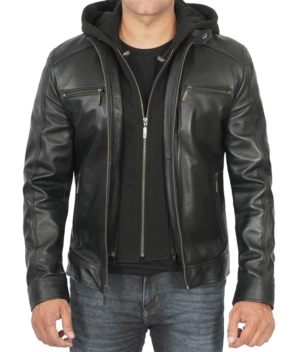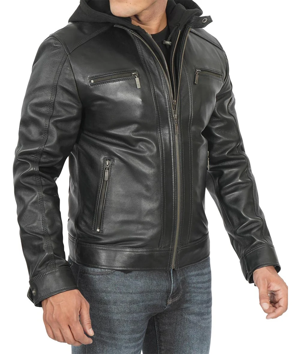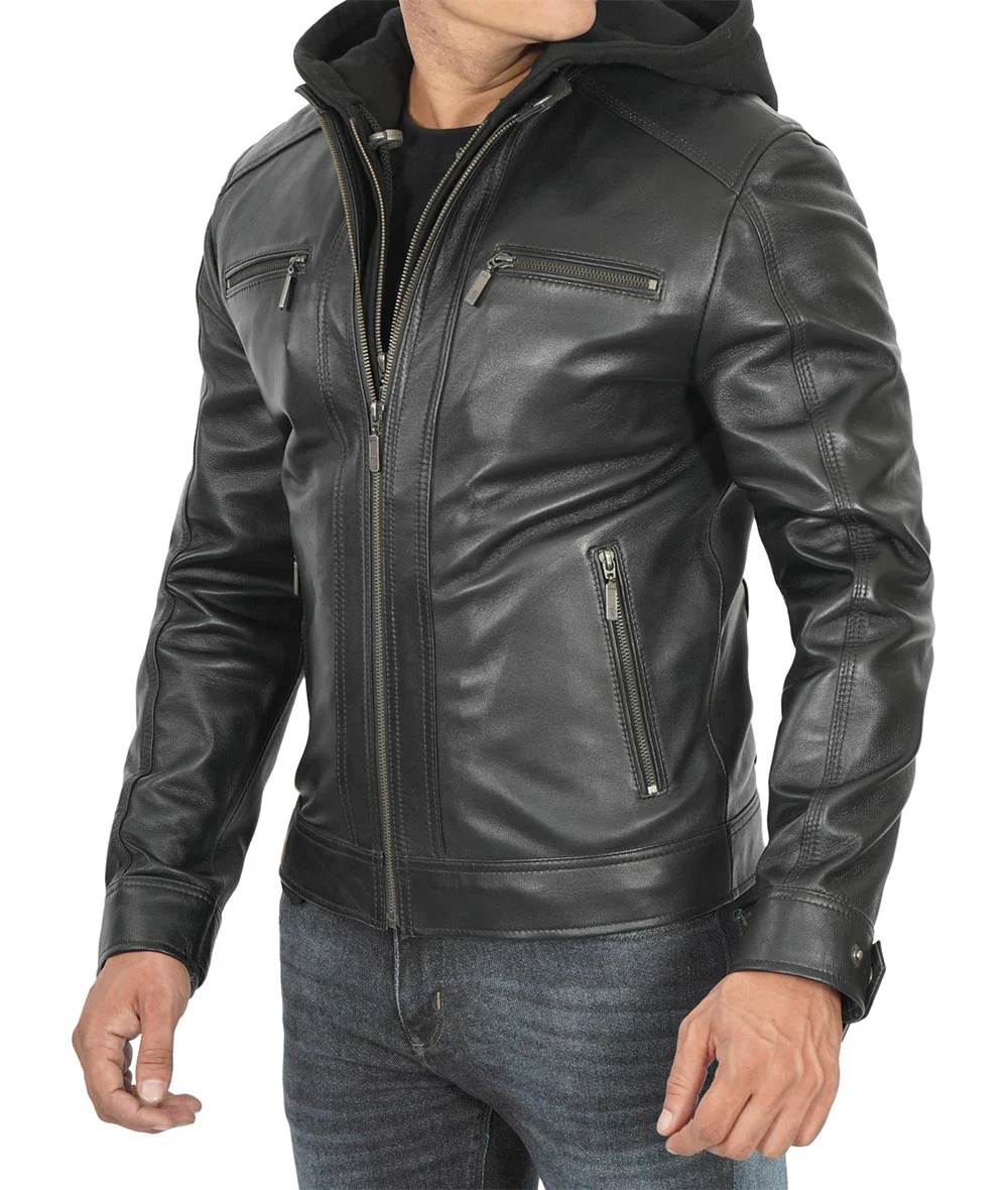 Mens Tall Black Leather Racer Jacket With Removable Hoodie