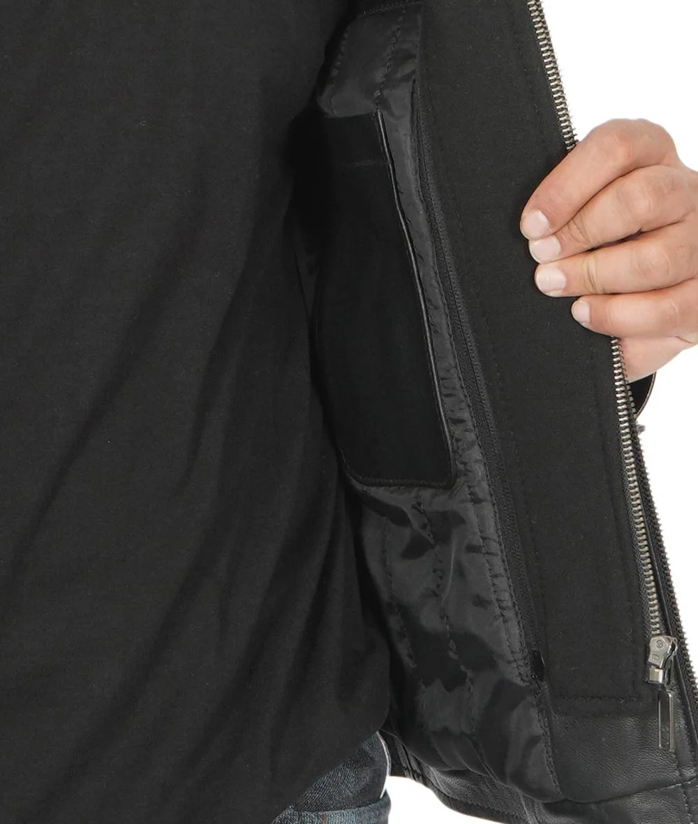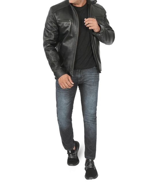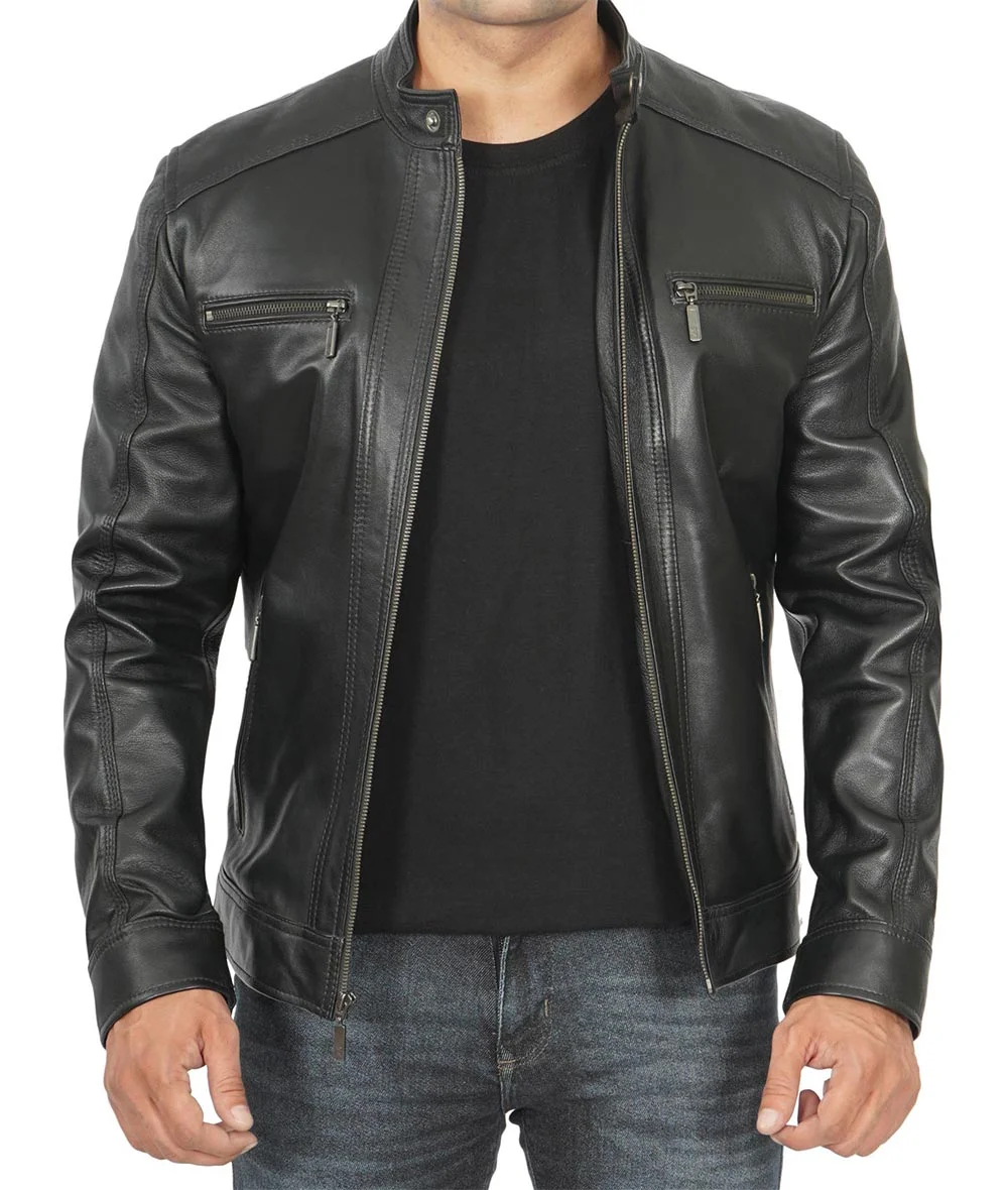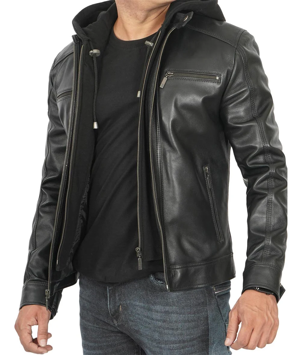 Mens Tall Black Leather Racer Jacket With Removable Hoodie
