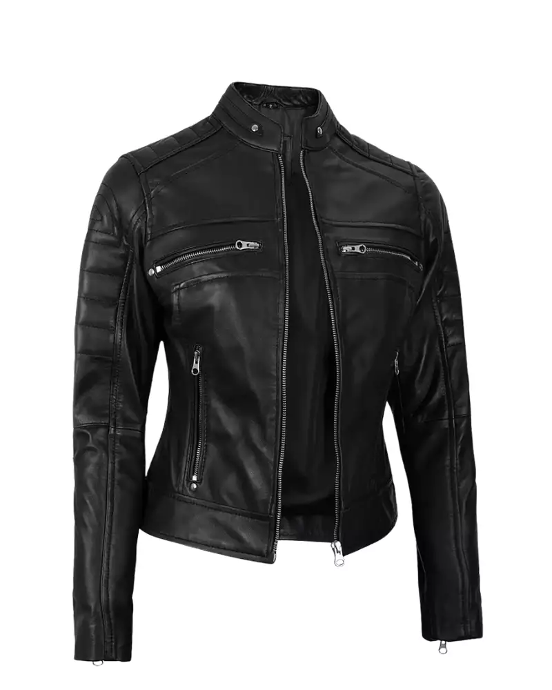 Women Black Cafe Racer Biker Leather Jacket