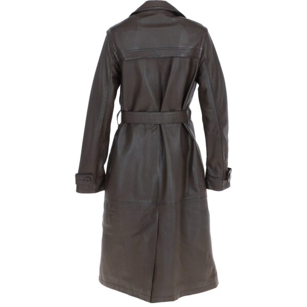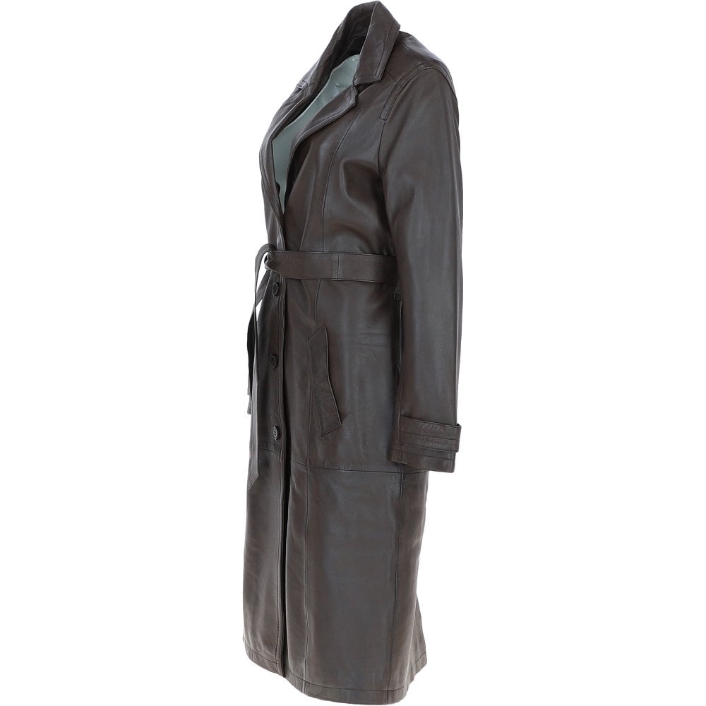 Women Dark Brown Longline Waist Tie Leather Coat