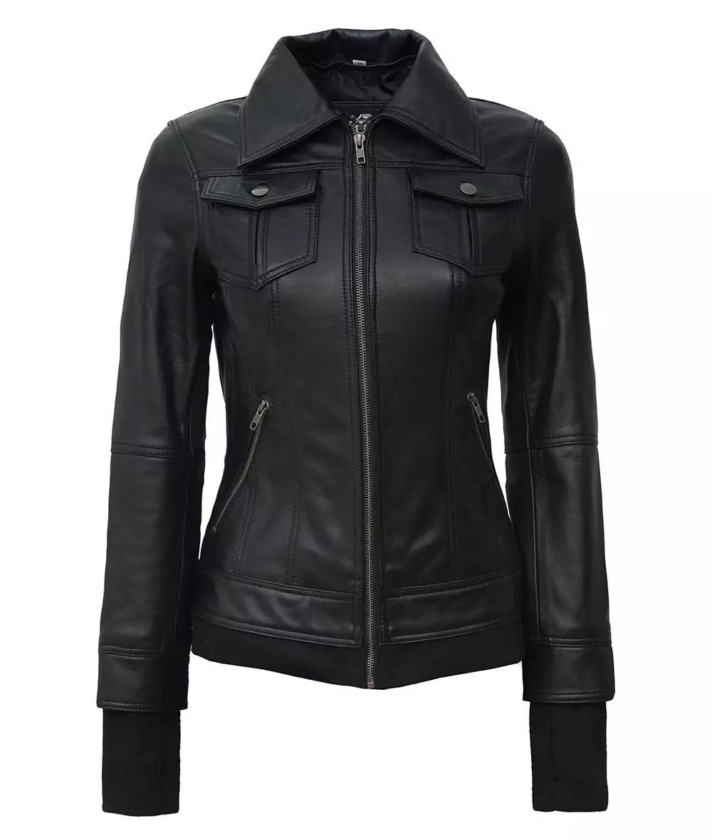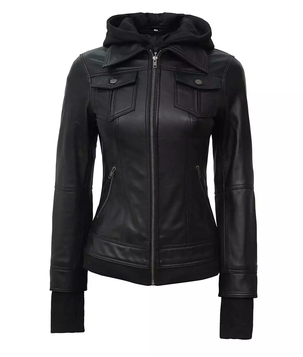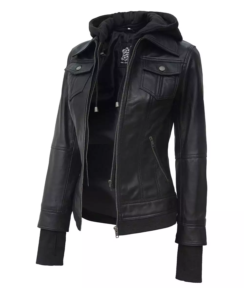 Women Tall Black Leather Jacket With Removable Hood