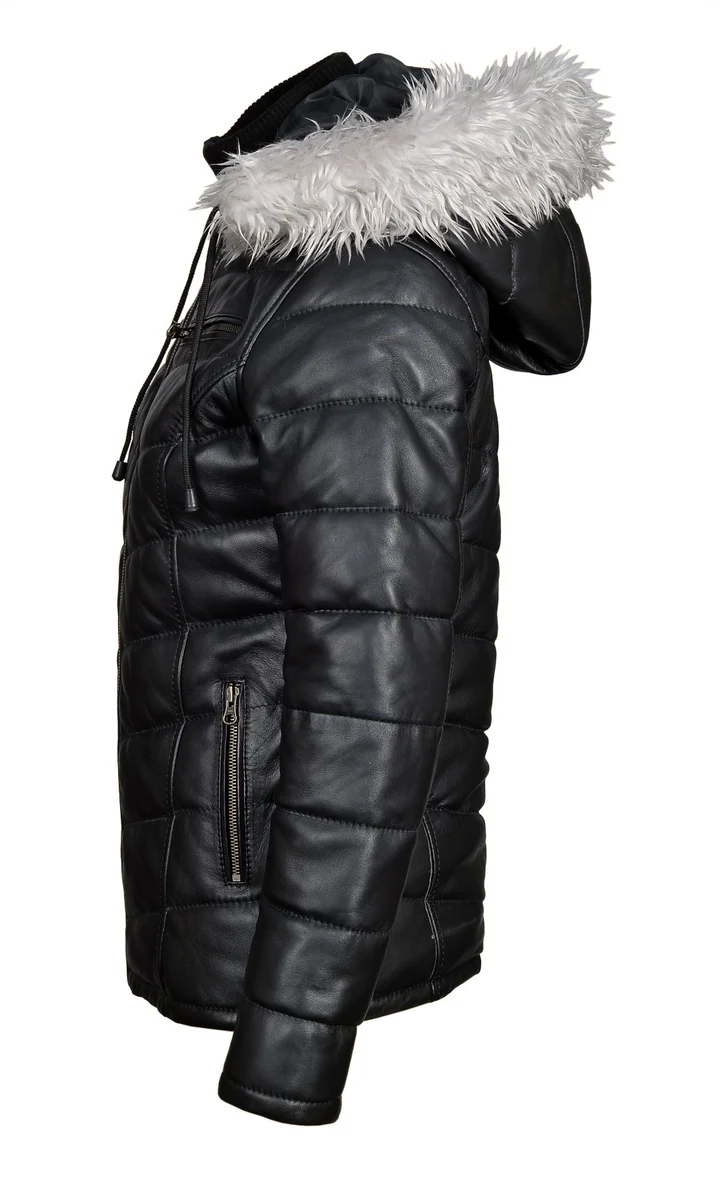 Women Winter Fur Trimmed Hoodie Puffer Leather Jacket