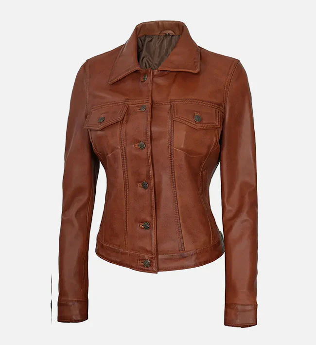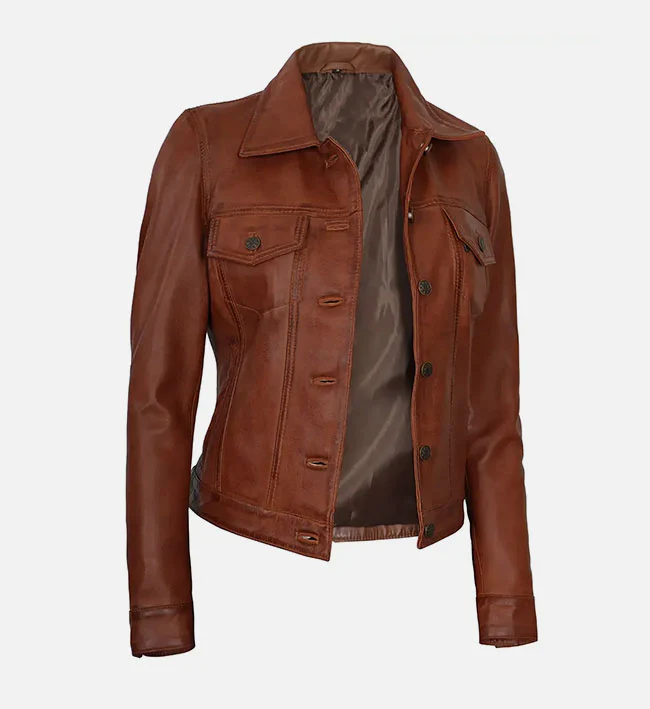 Womens Cognac Brown Trucker Leather Jacket